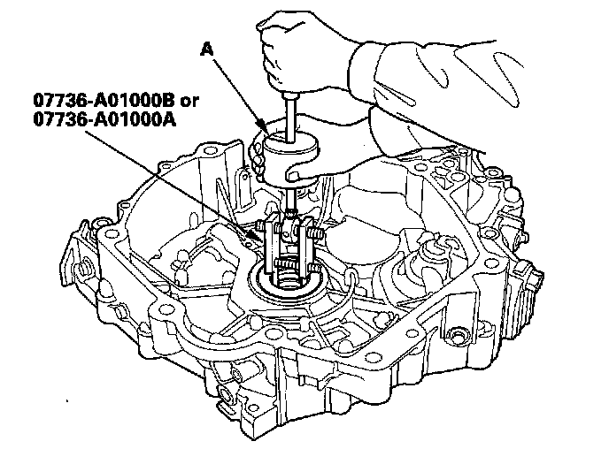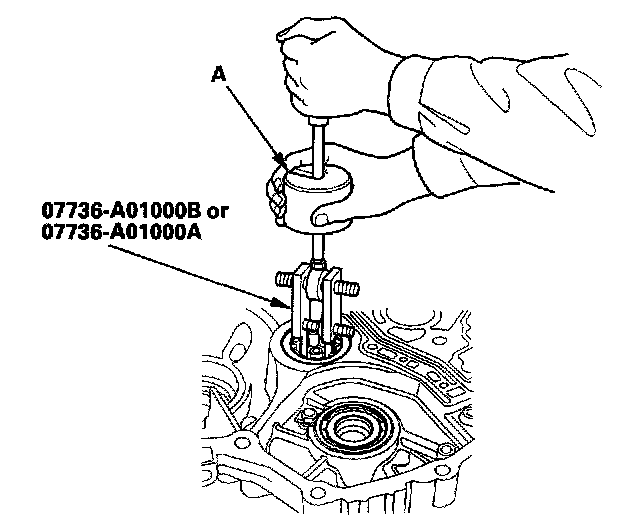 1. Remove the mainshaft bearing and the oil seal with the special tool and a commercially available 3/8"-16 slide hammer (A).