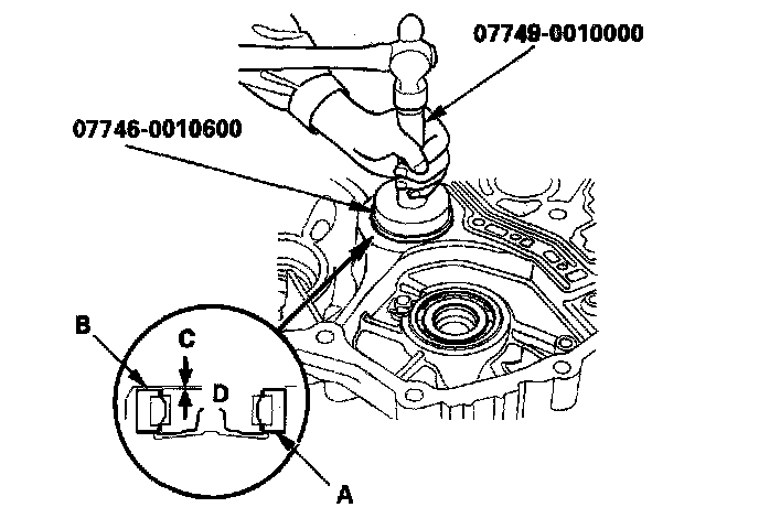 3. Install the new countershaft bearing (B) in the housing with the special tools; install the bearing outer race surface in height (C) of 0-0.03 mm (0-0.001 in.) above the housing surface (D). Do not install the bearing exceeding 0.03 mm (0.001 in.) high from the housing surface.