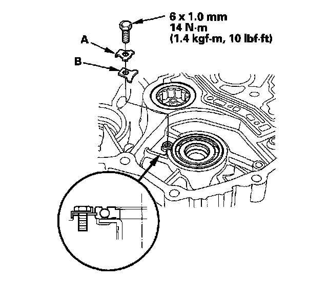 1. Remove the bolt, then remove the lock washer (A) and the bearing set plate (B).