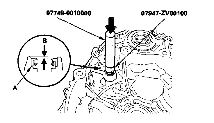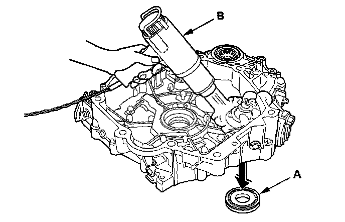 2. Install the new oil seal (A) in the torque converter housing in depth (B) of 0.5-1.5 mm (0.02-0.06 in.) below the housing surface with the special tools.