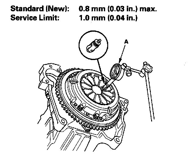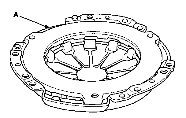 1. Check the height of the diaphragm spring fingers using the dial indicator (A). If the height is more than the service limit, replace the pressure plate.