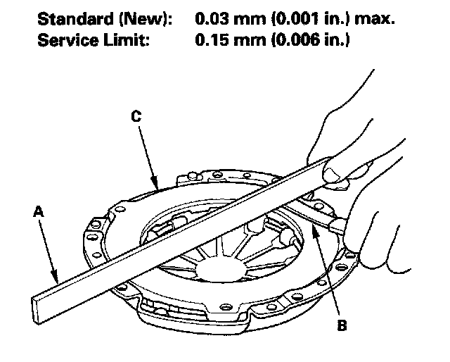 6. Use a straight edge (A) and feeler gauge (B) to inspect the pressure plate (C) for warpage. Measure across the pressure plate. If the warpage is more than the service limit, replace the pressure plate.