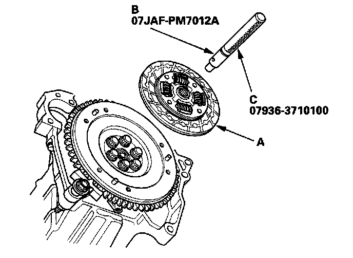 7. Remove the clutch disc (A), the clutch alignment shaft (B), and handle (C).