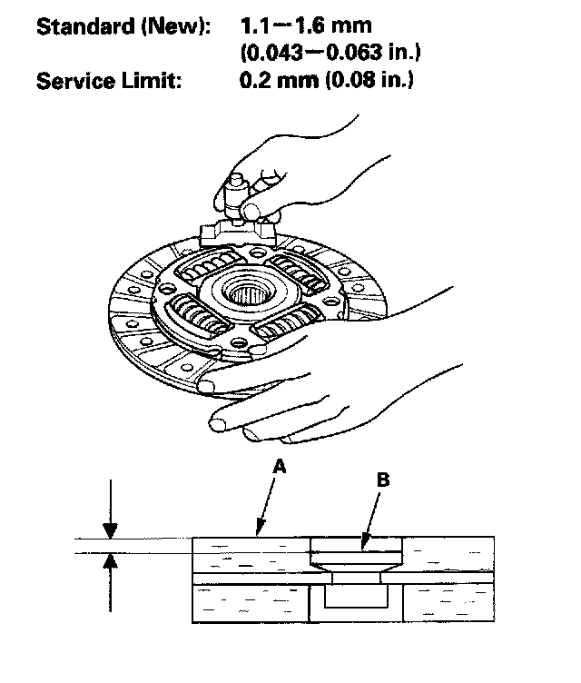 10. Measure the rivet depth from the clutch disc lining surface (A) to the rivets (B) on both sides. If the rivet depth is less than the service limit, replace the clutch disc.