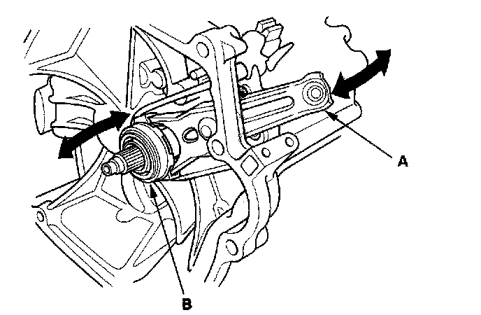 8. Move the release fork (A) right and left to make sure that it fits properly against the release bearing (B), and that the release bearing slides smoothly.