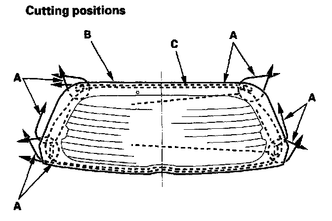 6. With a helper on the outside, pull the piano wire (A) back and forth in a sawing motion. Hold the piano wire as close to the rear window (B) as possible to prevent damage to the tailgate, and carefully cut through the adhesive (C) around the entire rear window.