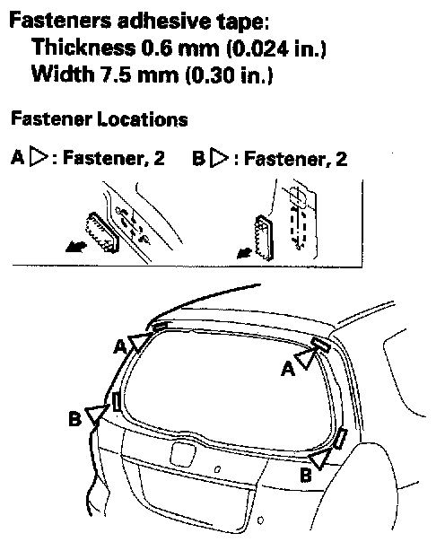 11. Attach the fasteners (A), upper rubber dam (B), and seals (C) with adhesive tape (with tailgate spoiler) to the inside face of the rear window (D) as shown. Attach the lower rubber dam (E) with adhesive tape along the edge of the rear window. Before installing the upper and lower rubber dams, apply primer to the inside face of the rear window.