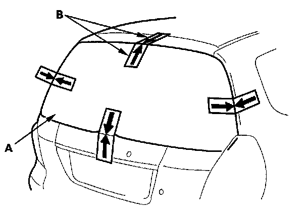 14. Set the rear window (A) in the opening, and center it. Make alignment marks (B) across the rear window and body with a grease pencil at the four points shown. Be careful no to touch the rear window where adhesive will be applied.