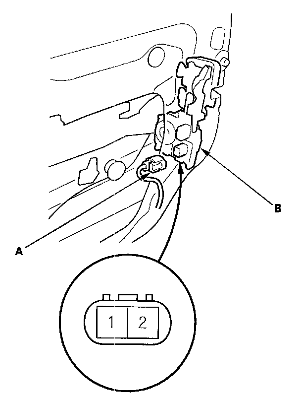 2. Disconnect the 2P connector (A) from the passenger's door lock actuator (B).