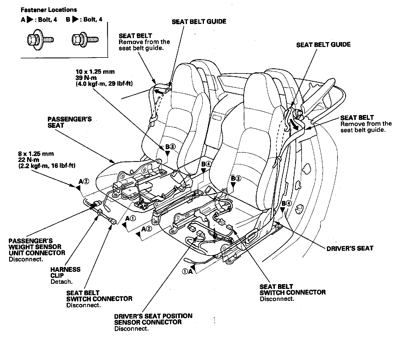 - Tighten the seat mounting bolts to the specified torque in the sequence shown. Slide the seat all the way back and tighten (!) and (@), then slide it forward and tighten (3) and (4).