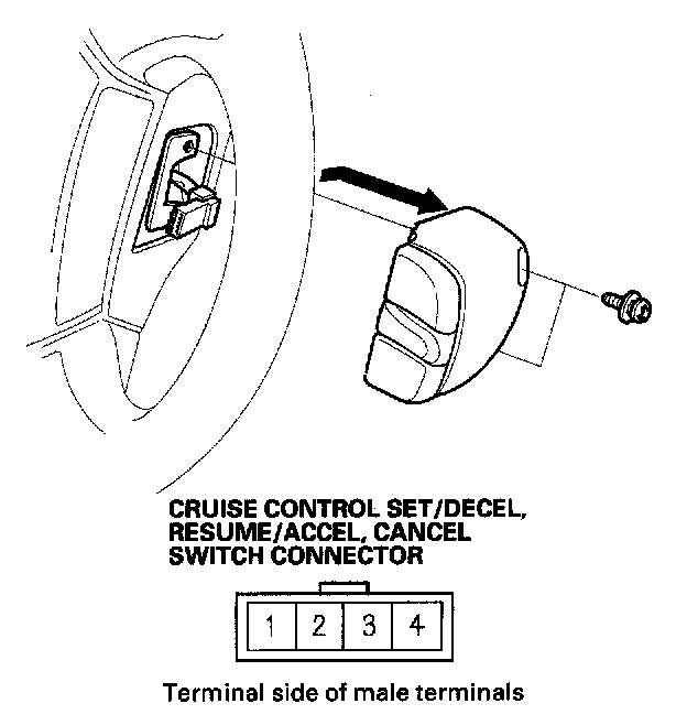 1. Remove the two screws securing the cruise control set/decel, resume/accel, cancel switch, then remove the switch.
