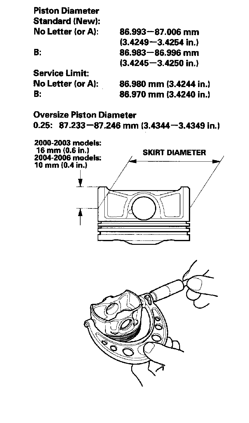 3. Measure the piston diameter at a point 16 mm (0.6 inch) (2000-2003 models), or 10 mm (0.4 inch) (2004-2006 models) from the bottom of the skirt. There are two standard-size pistons (No Letter or A, and B). The letter is stamped on the top of the piston. Letters are also stamped on the engine block as cylinder bore sizes.