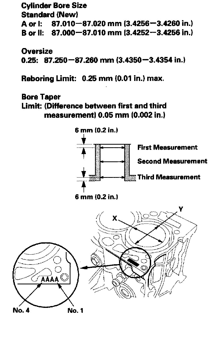 9. Measure the wear and taper in direction X and Y at three levels in each cylinder as shown. If measurements in any cylinder are beyond the oversize bore service limit, replace the engine block. If the block is to be rebored, refer to step 12 after reboring.