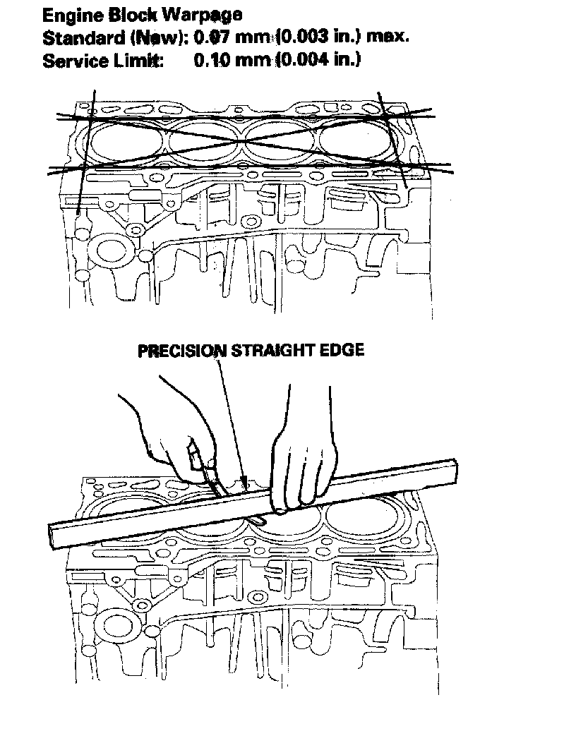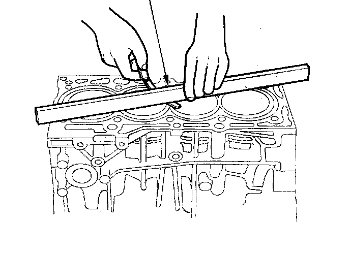 11. Check the top of the block for warpage. Measure along the edges and across the center as shown.