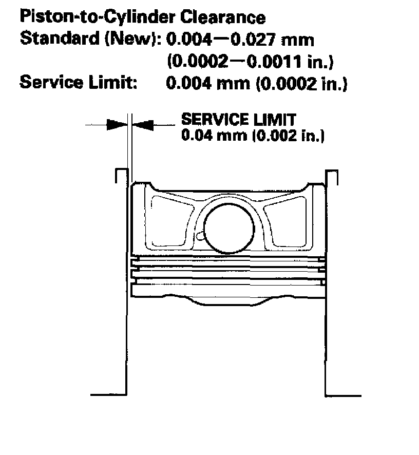 12. Calculate the difference between the cylinder bore diameter and the piston diameter. If the clearance is near or exceeds the service limit, inspect the piston and engine block for excessive wear.