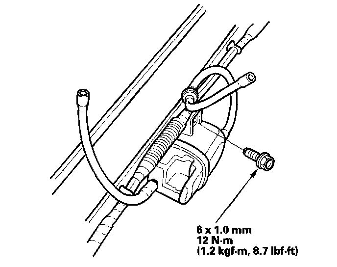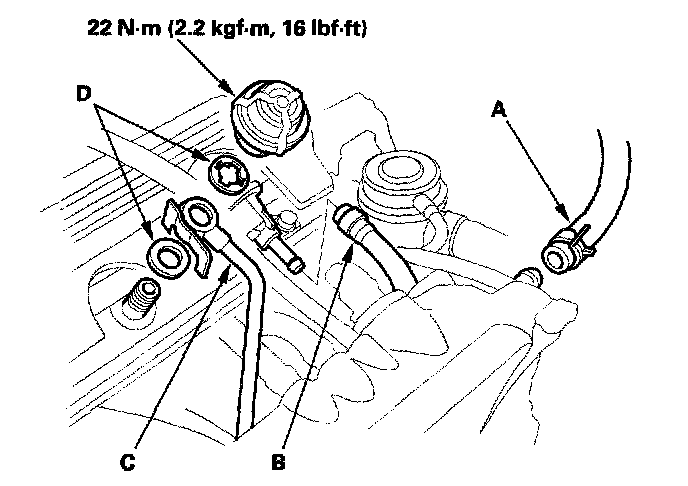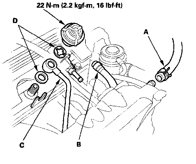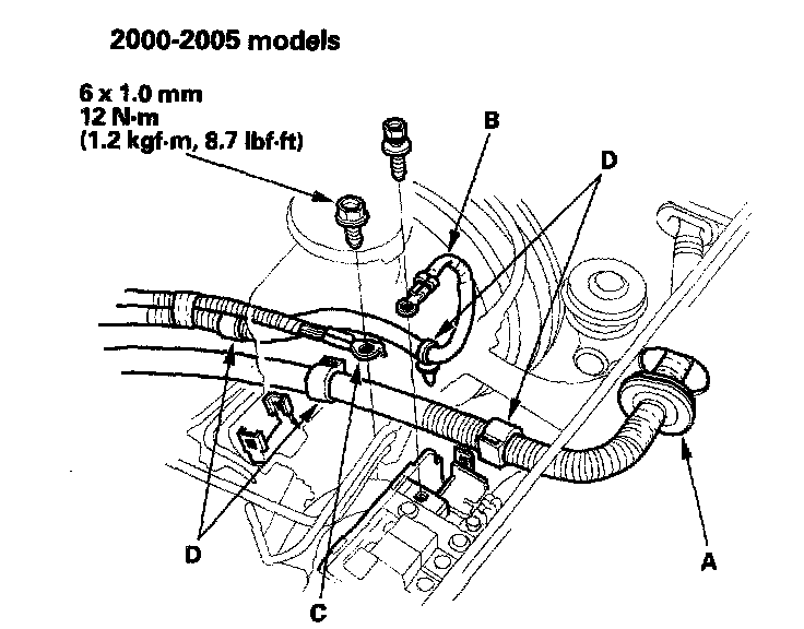 6. 2000-2005 models: Install the brake booster vacuum hose (A), fuel return hose (B) and fuel feed hose (C), using new washers (D).