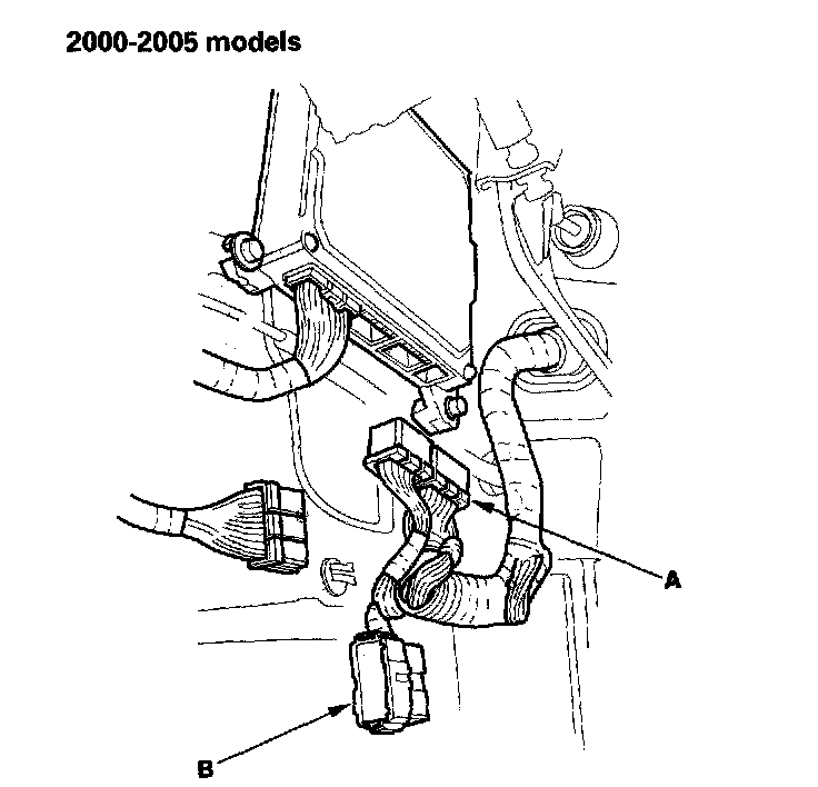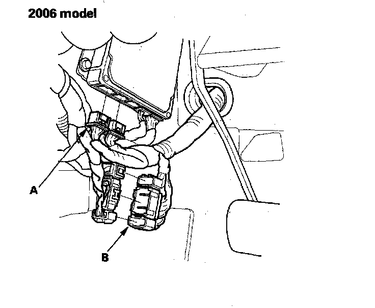 20. Connect the ECM connectors (A) and dashboard wire harness A connectors (B).