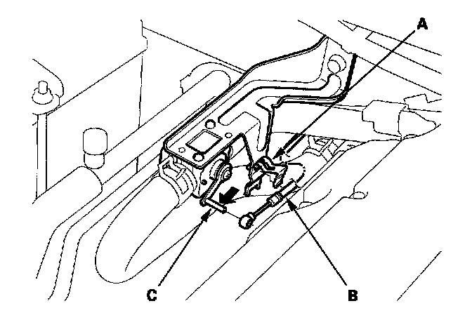 4. From under the hood, open the cable clamp (A), then disconnect the heater valve cable (B) from the heater valve arm (C). Turn the heater valve arm to the fully opened position as shown.