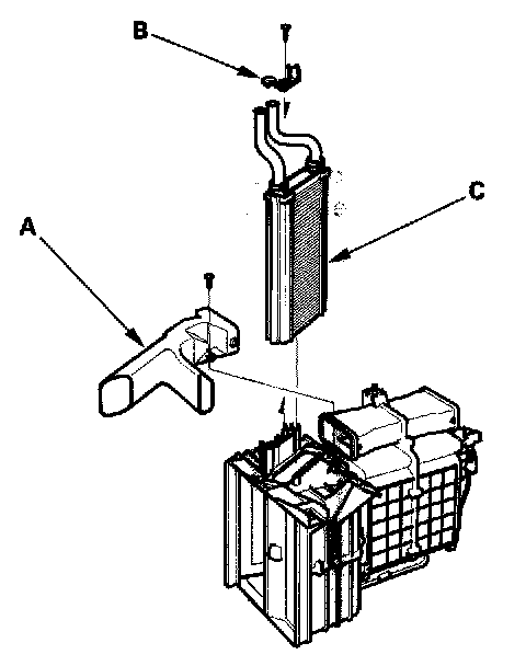 14. Remove the self-tapping screws and the passenger's heater outlet (A), then remove the self-tapping screw and the clamp (B). Be careful not to bend the inlet and outlet pipes during the heater core (C) removal, and pull out the heater core.