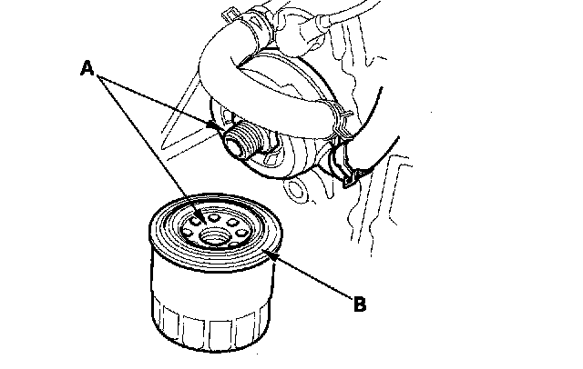 2. Inspect the threads (A) and rubber seal (B) on the new filter. Wipe off the seat on the engine block, then apply a light coat of new engine oil to the filter rubber seal. Use only filters with a built-in bypass system.
