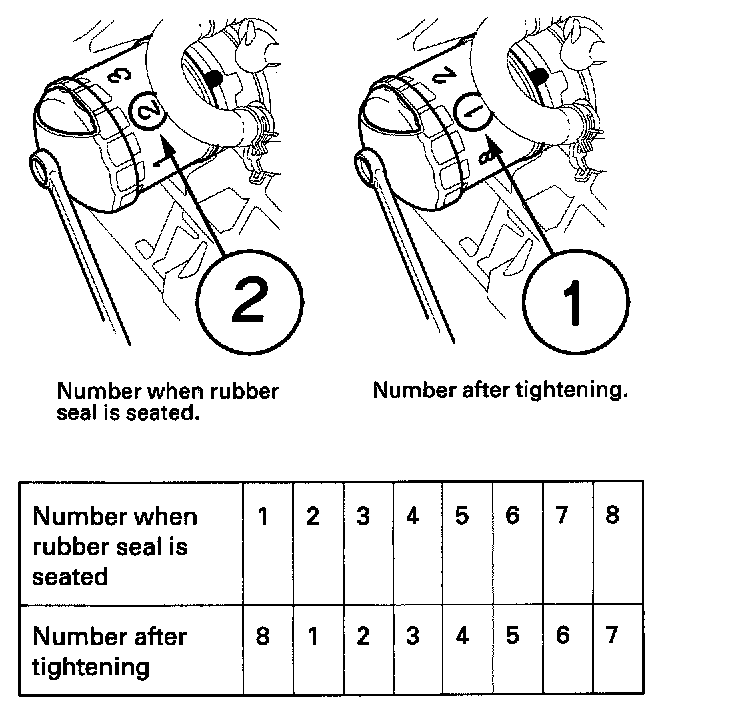 ^ Tighten the filter by turning it clockwise seven numbers from the one you noted, For example, if number 2 is at the bottom when the seal is lightly seated, tighten the filter until the number 1 comes around the bottom.