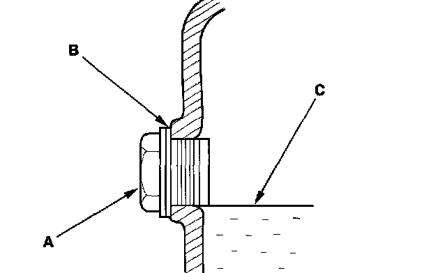2. Remove the oil filler plug (A) and the washer (B), check the condition of the fluid, and make sure it is at the proper level (C).