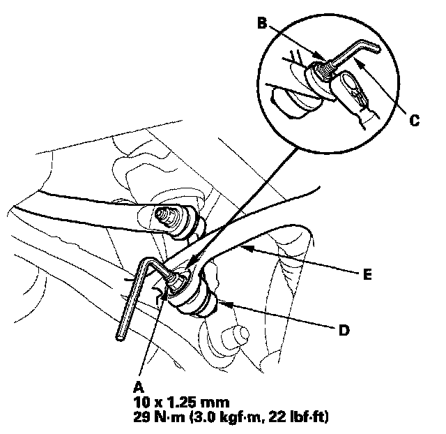 2. Remove the flange nut (A) while holding the joint pin (B) with a hex wrench (C), and disconnect the stabilizer link (D) from the lower arm (E).
