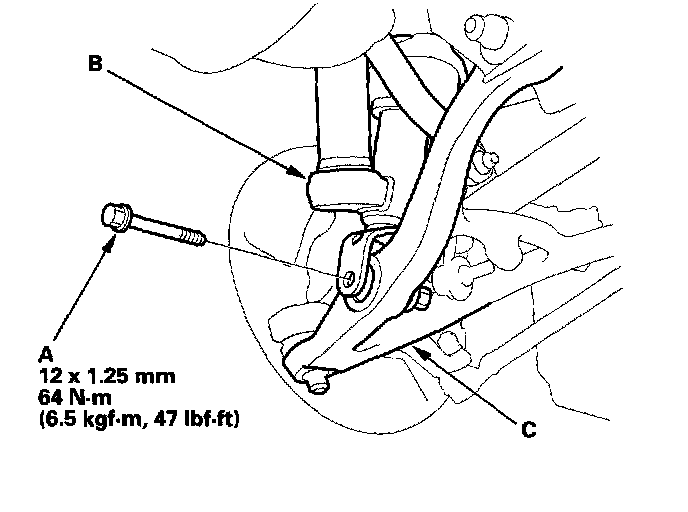 3. Remove the flange bolt (A), and disconnect the damper (B) from the lower arm (C).
