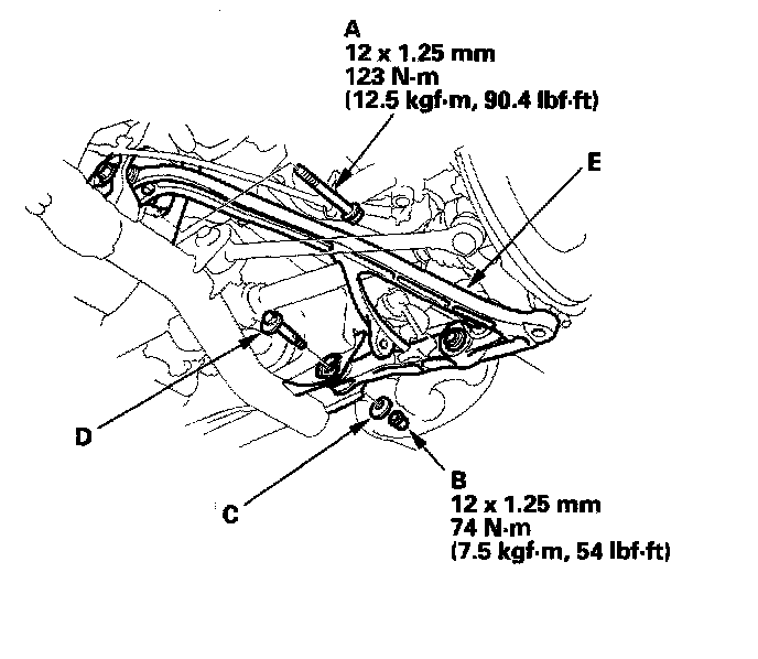 6. Remove the flange bolt (A), self-locking nut (B), cam plate (C), adjusting bolt (D), and the lower arm (E).