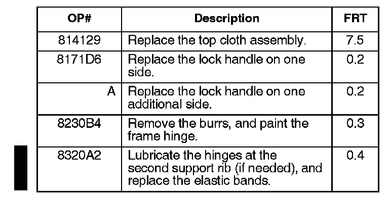 Replace the convertible top cloth and one or both lock handles, and remove any rough spots on the right rear frame hinge.