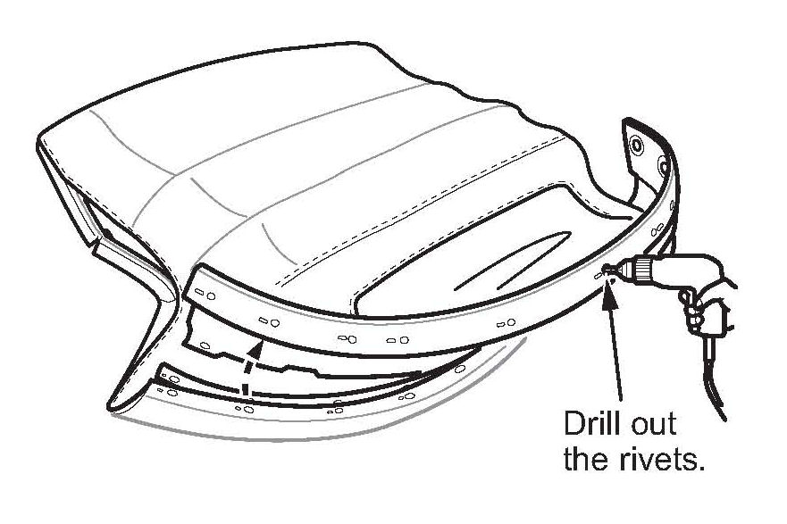10. Continue to drill or cut off the remaining portions of the rivets. Be careful not to make the hole in the rib any larger, or the new pop rivet will not hold securely.