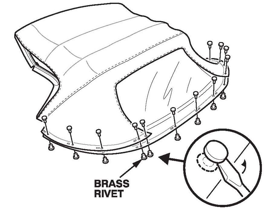 2. With the convertible top assembly out of the vehicle, use a white marker to draw a circle around each of the 11 rivets.