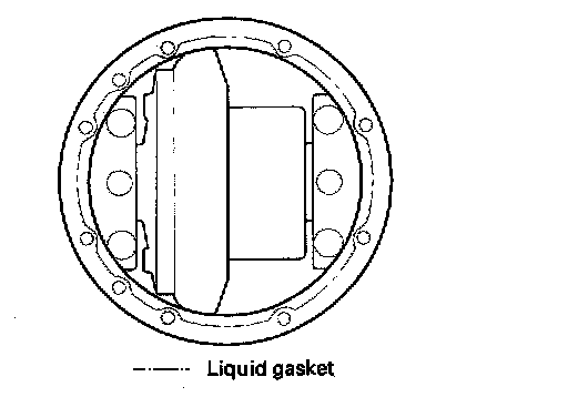 3. Remove the dirt and oil from the sealing surfaces. Apply liquid gasket (P/N 08718-0001 or 08718-0002) to the sealing surface. Make sure you seal the entire circumference of the bolt holes to prevent oil leakage.