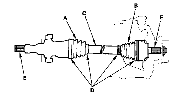 Driveshaft Inspection1. Check the inboard boot (A) and outboard boot (B) on the driveshaft (C) for cracks, damage, leaking grease, and loose boot bands (D). If any damage is found, replace the boot and boot bands.