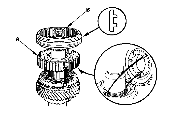 3. Install the 1st/2nd synchro hub (A) and the sleeve (B) as shown.