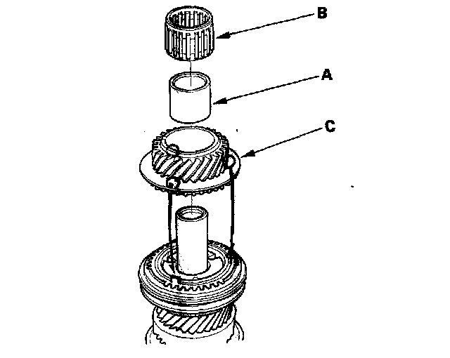 12. Install the distance collar (A), the 35 x 40 x 35 mm needle bearing (B), and 3rd gear (C).