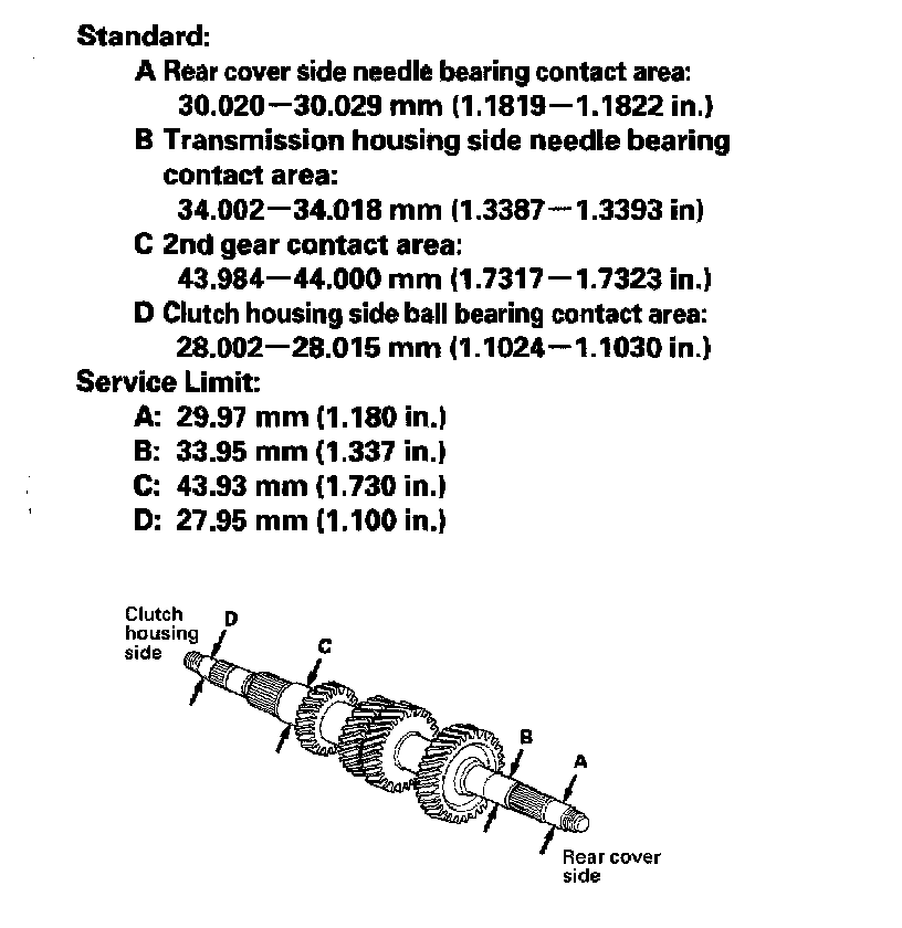 2. Measure the countershaft at points A, B, C, and D. If any part of the countershaft is less than the service limit, replace it.