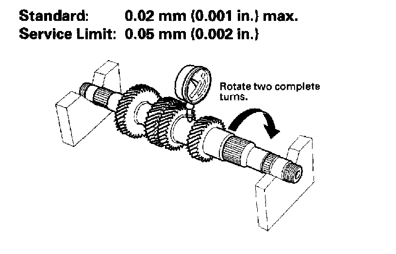 3. Inspect for runout by supporting both ends of countershaft. Then rotate the countershaft two complete turns while measuring with a dial gauge. If the runout is more than the service limit, replace the countershaft.