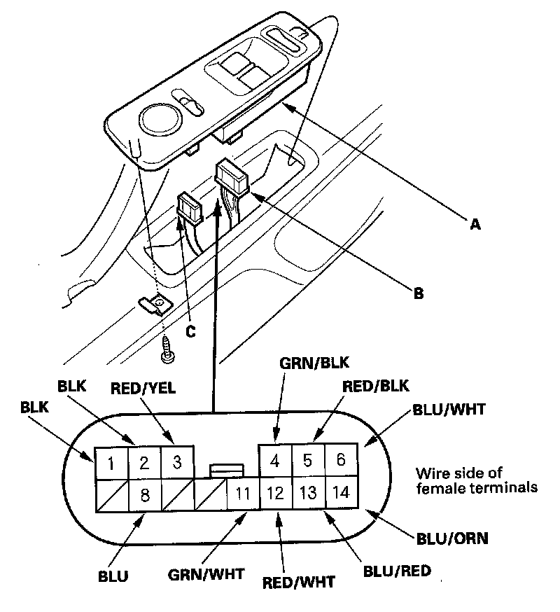 3. Disconnect the 14P connector (B) and the 10P connector (C) from the power window master switch.