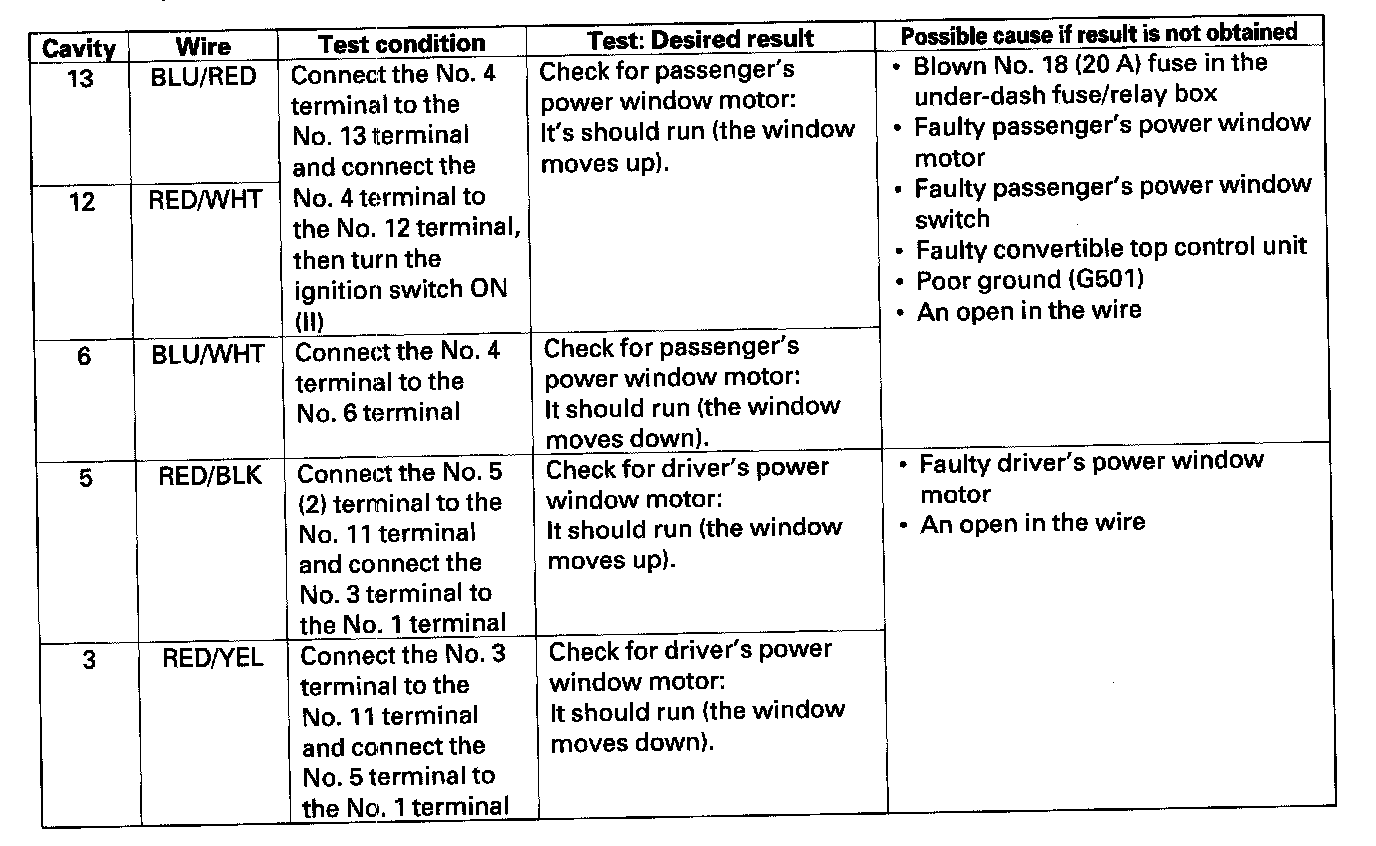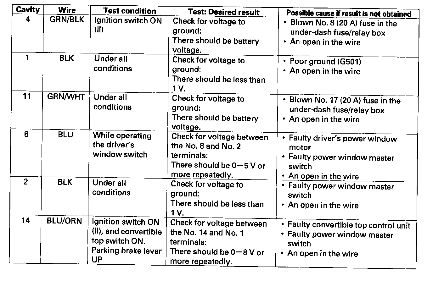 5. Reconnect the power window master switch, and perform the given input tests at the 14P connector.