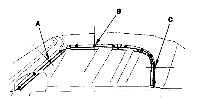 - Check the A-pillar-header weatherstrip, roof weatherstrips and B-pillar weatherstrip for damage or deterioration, and replace them if necessary.