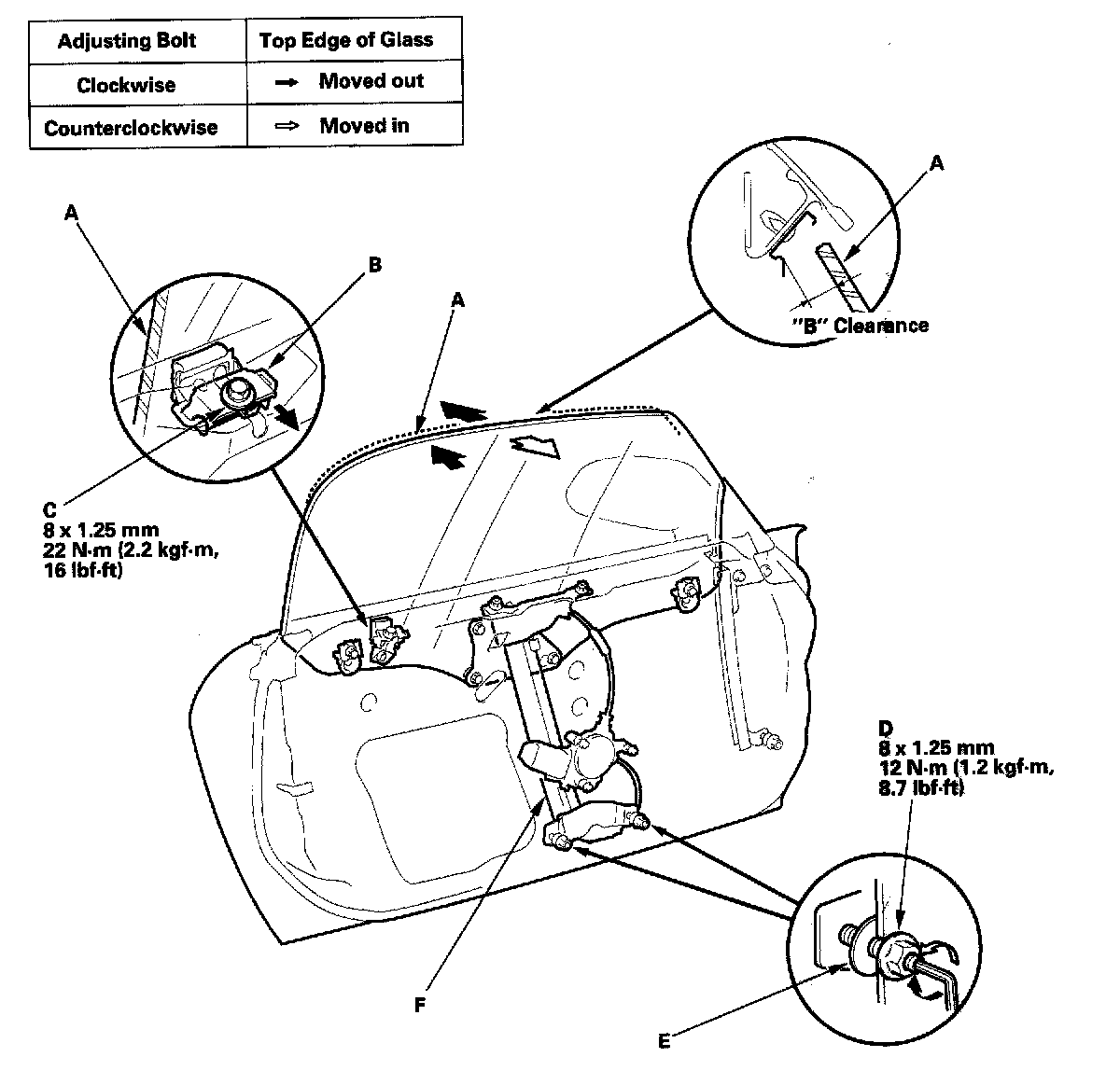 4. Turn the adjusting bolts (E) until the clearance "B" is within the specified limits. Turn the front and rear adjusting bolts the same amount to keep the regulator (F) parallel with the seating surface of the door.