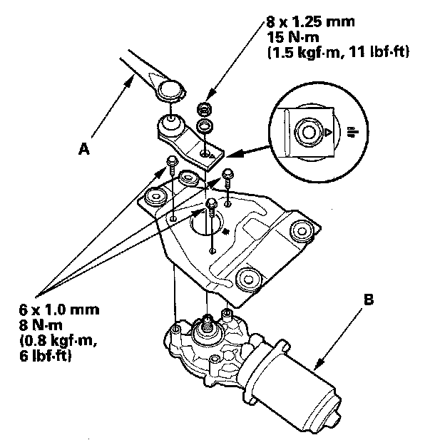 5. Remove the three mounting bolts and nut from the wiper linkage (A) to remove the wiper motor (B).