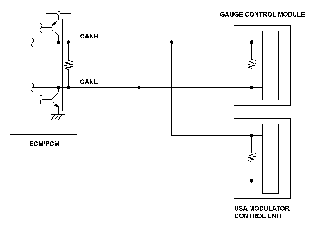 The controller area network (CAN) transmits/receives pulsing signals to/from the control modules simultaneously by using two signal lines (CANH and CANL). When the engine control module (ECM)/powertrain control module (PCM) does not receive the signals via the CAN lines for a set time or more, the ECM/PCM detects a malfunction and a DTC is stored.