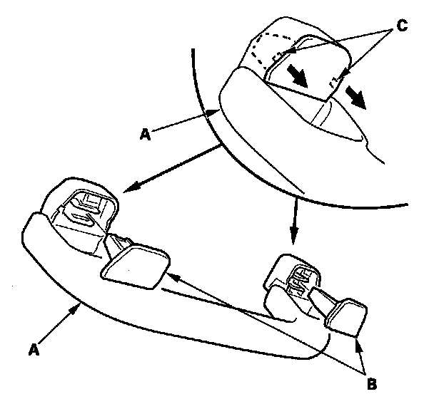 6. Install the clips (A) to the grab handle (B), then install the caps (C) fully into the clips.