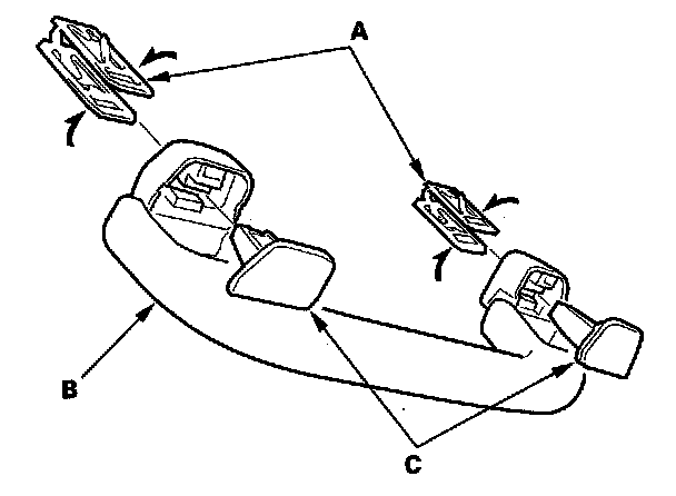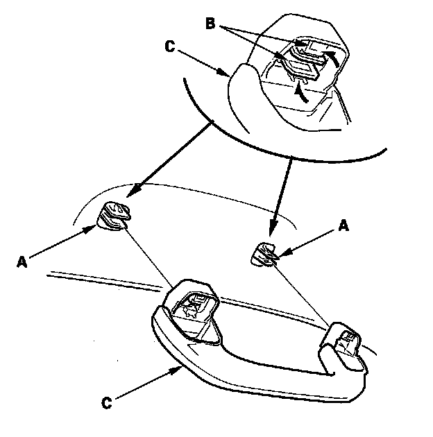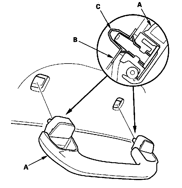 7. Position the grab handle (A) on the bracket (B), and push on the grab handle until the clips (C) snap into place securely.