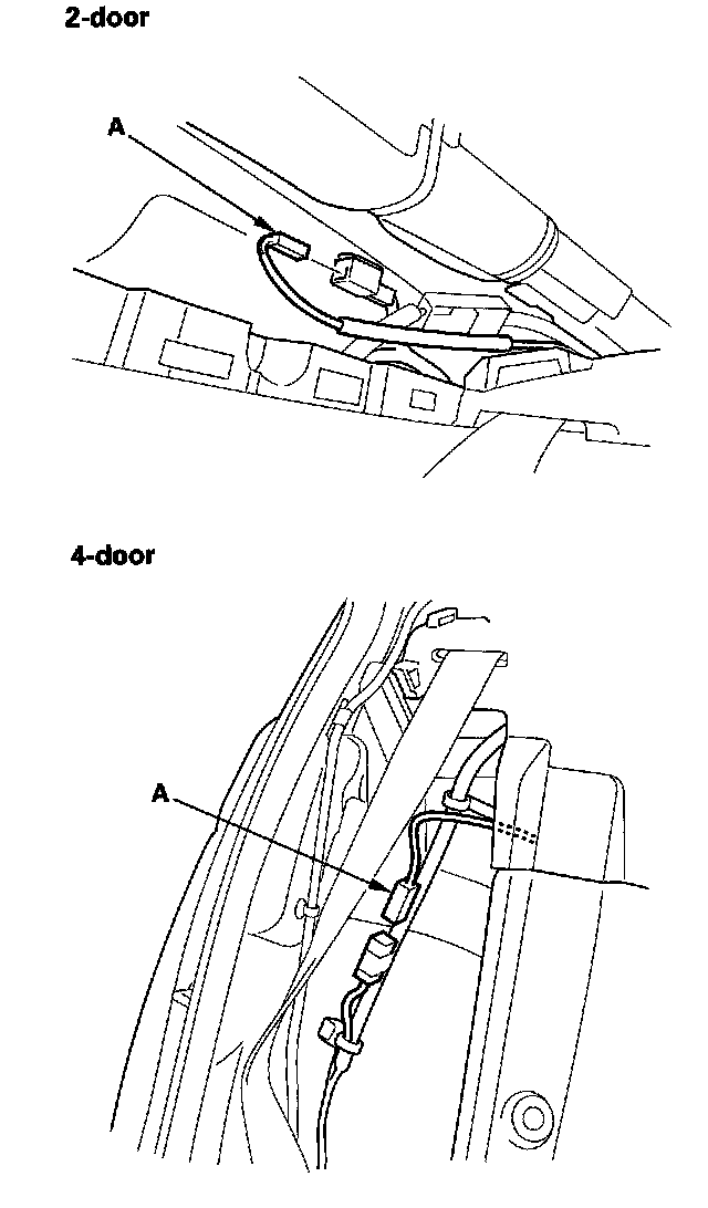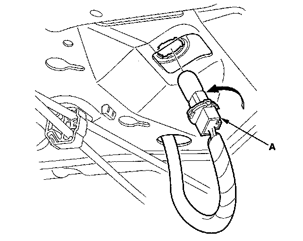 2. From the trunk compartment, turn the high mount brake light socket (A) 45° counterclockwise to remove the socket. 4-door is shown; 2-door is similar.