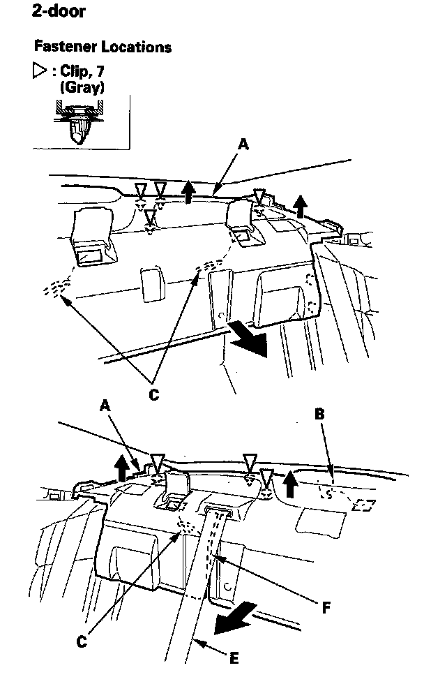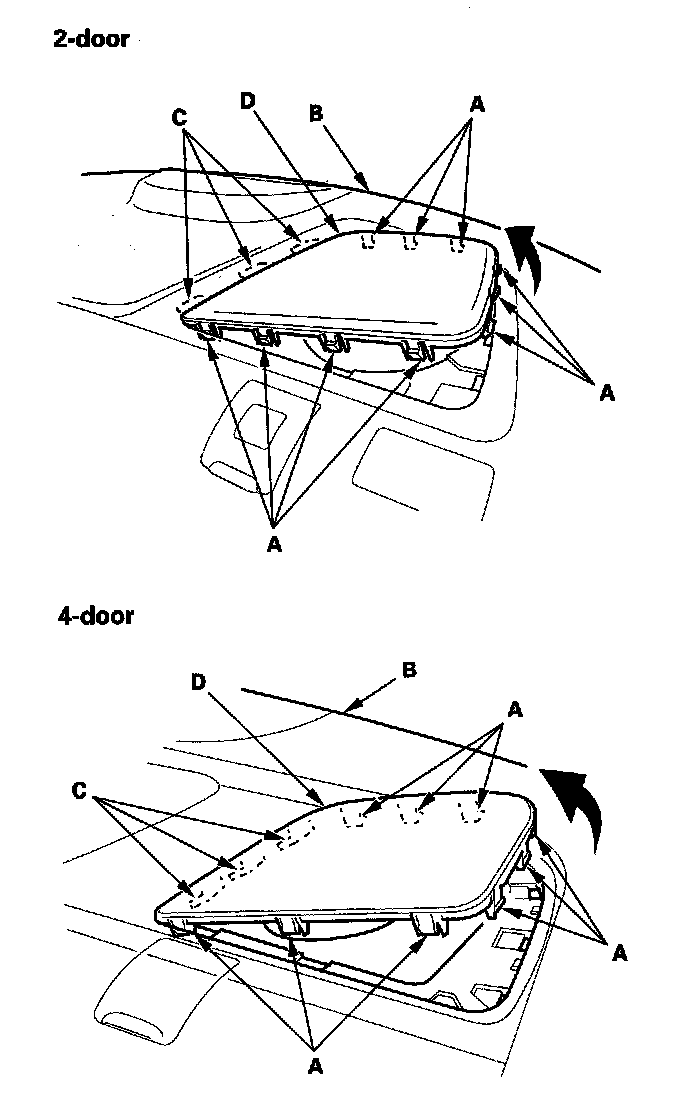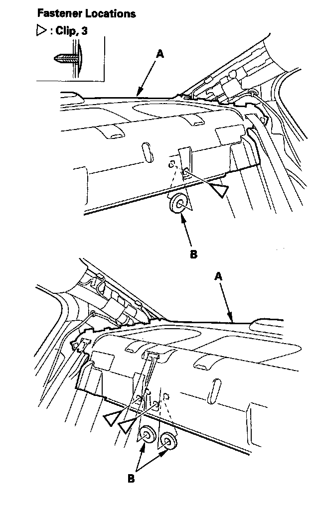 4. Remove the clips securing the rear shelf (A), and remove the washers (B) from between the rear shelf and body. 4-door is shown; 2-door is similar.