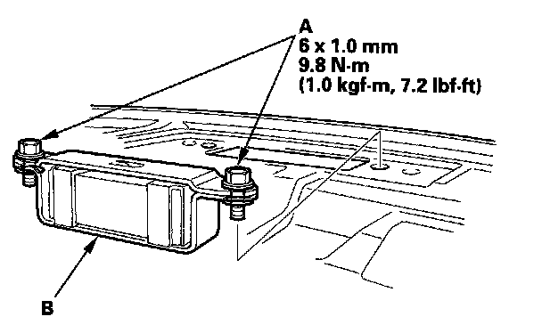 2. Remove the bolts (A), then remove the rear parcel shelf dynamic damper (B). Take care not to hit the rear window when removing the bolts.