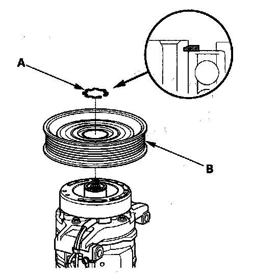 3. If you are replacing the field coil, remove the snap ring (A) with snap ring pliers, then remove the pulley (B). Be careful not to damage the pulley or the A/C compressor.